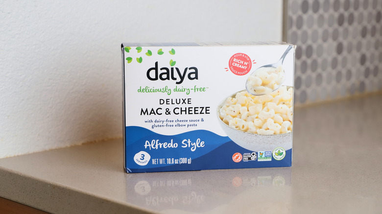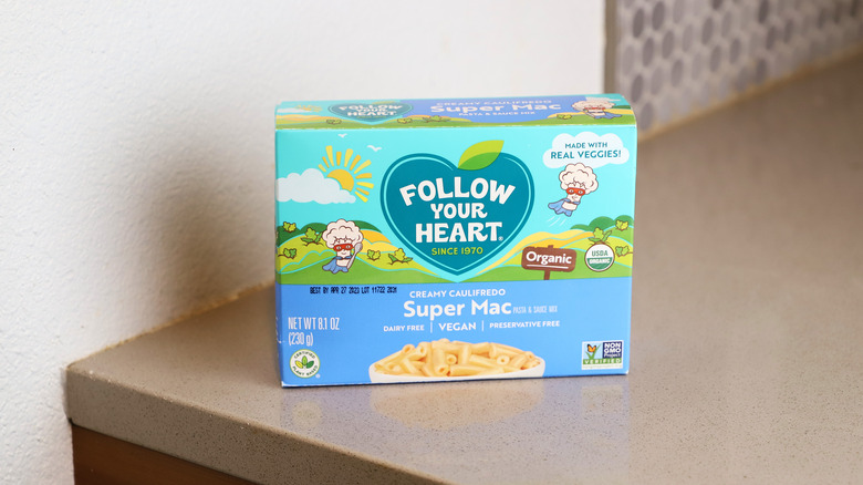 A vegan entry into our small but mighty inventory of grocery store macaroni and cheese, Follow Your Heart has manufactured plant-based food since 1970, way before the vegan boom, and is perhaps best-known (and beloved) for inventing Veganaise, or the first vegan mayonnaise (via VegNews). Though Follow Your Heart mostly specializes in plant-based spreads, "cheeses," and salad dressings, the brand also makes fully composed meals, like the Creamy Caulifredo Supermac we took home (they also offer a Cheezy Carrot variation).