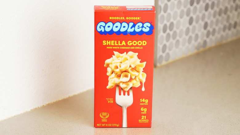 Six flavors round out the Goodles line of macaroni and cheese: Cheddy Mac (classic cheddar), Mover & Shaker (pepper parmesan), Shella Good (white cheddar), Twist My Parm (Asiago cheese), Vegan is Believing (plant-based), and Down the Hatch (spicy). Considering each box contains 21 nutrients, it's no surprise Goodles mac and cheese claimed a Clean Label Project Purity Award. We picked out the Shella Good box due to its universal appeal and boiled the tiny pasta shells, before stirring in the packet of dry-aged cheese powder with a tiny bit of butter and milk. Before even adding the dairy, we were happily taken aback by how visually creamy the cheese dust blended into the pasta shells.
