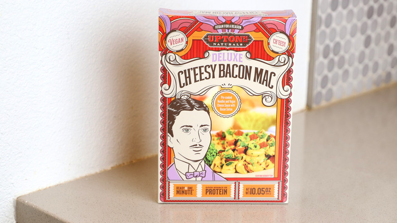 Had we known that Upton's Naturals plant-based macaroni and cheese, or Ch'eesy Mac (the apostrophe feels decorative) came pre-boiled we might have left the box on the Whole Foods shelf we found it on. But the temptation of its cluttered, mismatched branding left us curious enough to reach for the hot red package featuring an illustration of a Prohibition-era gentleman (or per 2010s bartender) with a bow-tie, and pencil mustache looking stoically into the middle distance.
