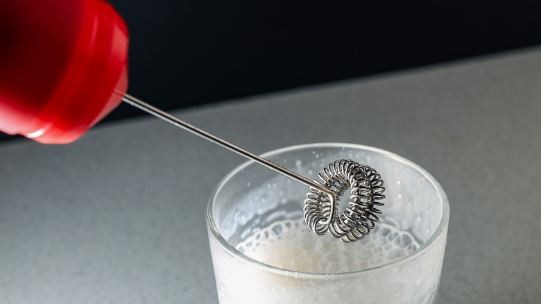 You can't underscore the addition of foam to your favorite cocktails. Although the best way to foam egg whites for cocktails might be with a dry shake (which involves placing the egg whites in a jar and shaking vigorously before adding ice), this method often lends itself to a big mess. Liquor.com notes that you should consult your milk frother instead of dry shaking. Using your milk frother — specifically tilting the glass to get the perfect whirlpool angle — works for frothing egg whites, aquafaba, or non-dairy or dairy-based cocktail ingredients.