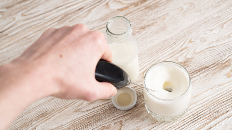 Coffee creamers sold at the grocery store can be ladened with sugars, emulsifiers, and other ingredients that don't sit well with your stomach. With your milk frother, you can make super creamy creamer at home with the addition of a few simple ingredients. To make your own homemade coffee creamer, combine sweetened condensed milk and evaporated milk together over low-medium heat until warmed through. Froth the dairy ingredients with your favorite flavorings and sweeteners like vanilla bean and maple syrup. You can also add hazelnuts to the saucepan while the milk is warming through for a nutty flavor — just be sure to remove the nuts before you froth.