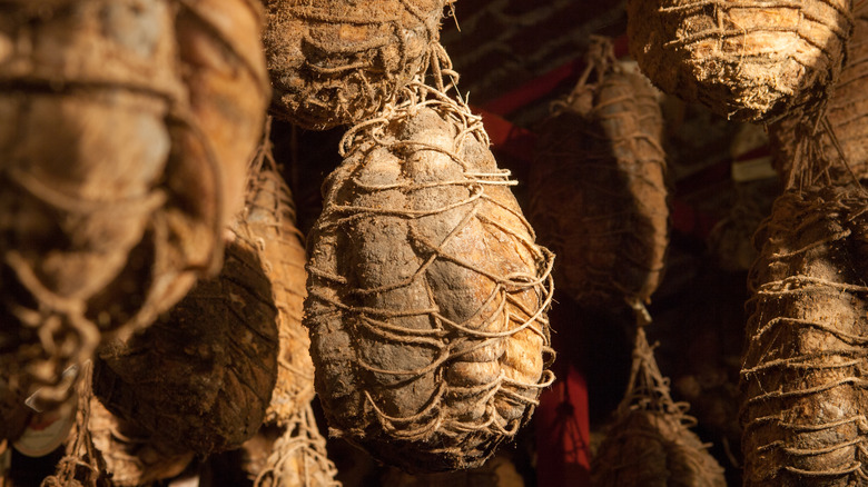 According to Food and Wine, the way in which culatello is made has not changed a wink since the middle ages. The process begins with the cut of pig. The choicest section of the thigh muscle is selected for the curing process. This cut gives the culatello its name, as it literally translates to "little ass." The meat is then seasoned with liberal amounts of salt, black pepper, and garlic before being wrapped in a clean pig's bladder. It is then netted and hung for curing in a cold, wet cellar.