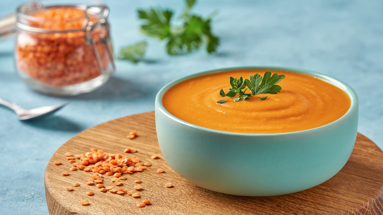 There are a few things you should consider when using this type of thickener. Both lentils and beans should be mashed or puréed before adding them to a soup. When looking for a velvety texture, you'll have to purée your cooked legumes for several minutes. If you're cooking lentils, you should also know that cooking red lentils changes their color to yellow. If you're trying to make a dark-colored soup, this can be an issue.