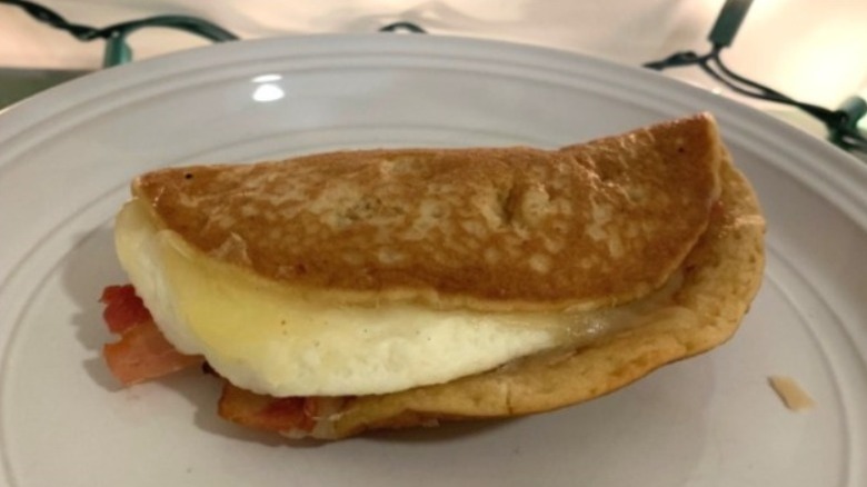 And here's the one with sausage! Featuring more than subtle hints of sweet maple, the Sausage Wake-Up Wrap really brings out those buttermilk pancake notes. It's also easily a better portion and proportion than bacon. The meat itself is nicely cooked, juicy, and mildly flavorful. Since the Sausage Wake-Up Wrap maintains the good stuff and improves upon the meat of its bacon counterpart, it's a practically perfect breakfast for cozy holiday comfort food. Our biggest, and possibly only, complaint is that we were promised to have our wraps served with a side of syrup, but there was no syrup to be found. So just in case your location is similar, be sure to specify you want that syrup. Though it's worth noting that the addition probably makes the whole neat and tidy idea more complicated — everyone knows that it's humanly impossible not to get something sticky when syrup is involved. But nothing goes better with maple-scented sausage and buttermilk pancakes than syrup, even when it's breakfast syrup as opposed to pure maple syrup.