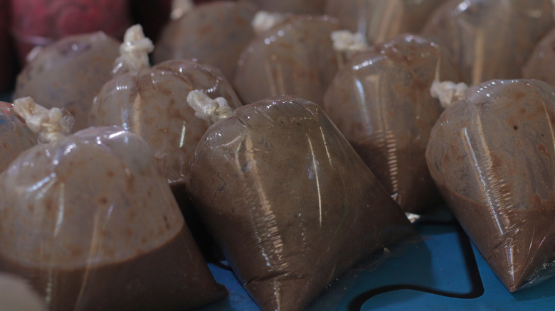 In his quest to describe how bagoong is made, American chef Nate Appleman describes a trip to the central Philippine province of Negros Occidental, where he witnesses fishermen trawling for baby shrimp "the size of long-grain rice" using long nets, laying the same nets out on bamboo tables where fish and shrimp are sorted from random debris, per Food Republic. Once the shrimp have been dried, they are then transferred into a bucket where they are trampled on by a fisherman, as salt is added by a helper. The shrimp are then divided into baggies and left to ferment.