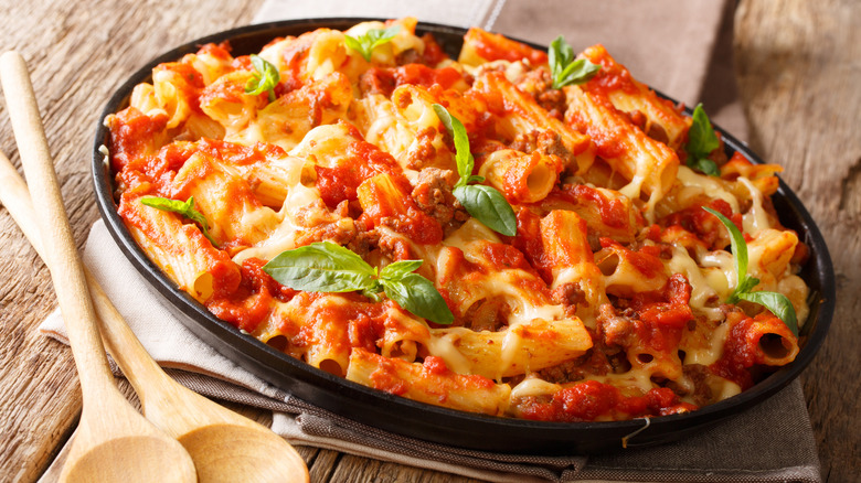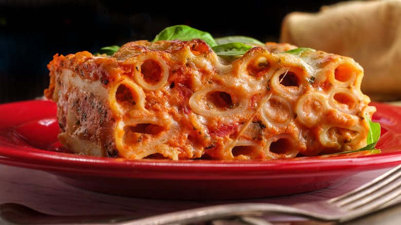 Any one of us who has eaten baked ziti — that oh-so-delicious baked casserole packed with cooked pasta, tomato sauce, often some type of cooked ground meat, and a variety of cheeses — knows firsthand how great those little tubes are at snagging the delicious range of tastes and textures found within the dish. A hearty, fairly easy meal that's often served at family dinners or gatherings such as potlucks, baked ziti is comfort food at its finest. But did you know that, traditionally, the dish serves a far more official function — other than simply tasting great?