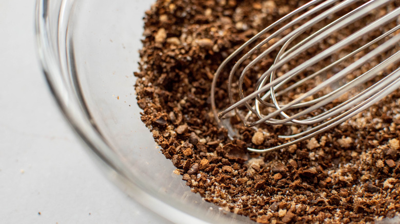 - Whisk the coffee grounds, garlic powder, chipotle powder, salt, pepper, and brown sugar together in a small bowl.