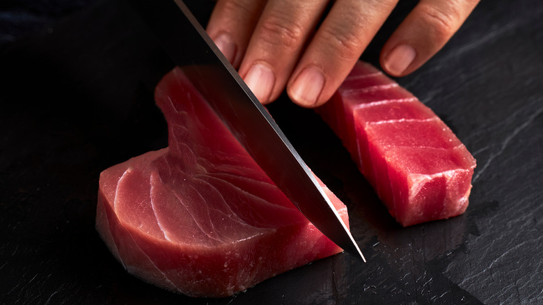 There are so many tips and tricks out there for slicing fish, such as using a smooth motion, wiping the blade of the knife after each fish slice, and angling your blade differently depending on which kind of fish you're slicing, per Made In Cookware. But as Food & Wine suggests, make sure the fish is cold beforehand because it'll be way easier to slice (the fish should also remain in the fridge until it's slicing time). Granted, it's probably best not to slice frozen fish because it'll be too "hard and dense," according to Leaf.TV. In this case, you'll want to thaw it via overnight refrigeration.