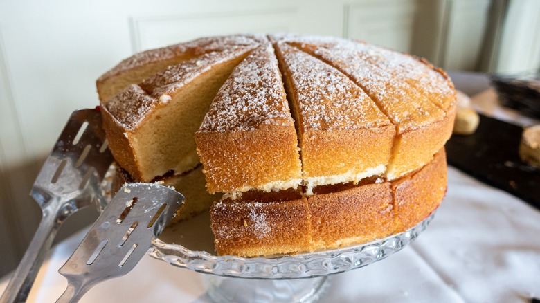 Queen Victoria was well known for her sweet tooth, as well as her trendsetting staying power within popular culture. According to Town & Country, she popularized the custom to wear a white wedding gown, alongside the commissioning of opulent wedding cakes to commemorate the occasion, as she did when marrying Prince Albert. Her cake, though not sponge, was recorded to have weighed around 300 pounds (via National Geographic)! Thankfully, a Victoria sponge recipe is quite manageable and easy to perfect.
