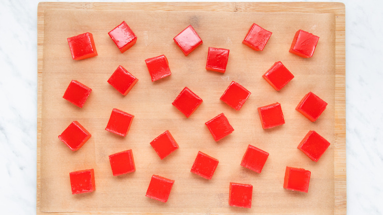 Once set, remove the block from the pan and slice it into cubes. As a helpful reminder, this recipe yields 32 cubes! You can place the cubes on a plate or a board. but just make sure that you leave space in between each one so they don't stick together. Now, they need to sit and sweat for t least 24 hours.