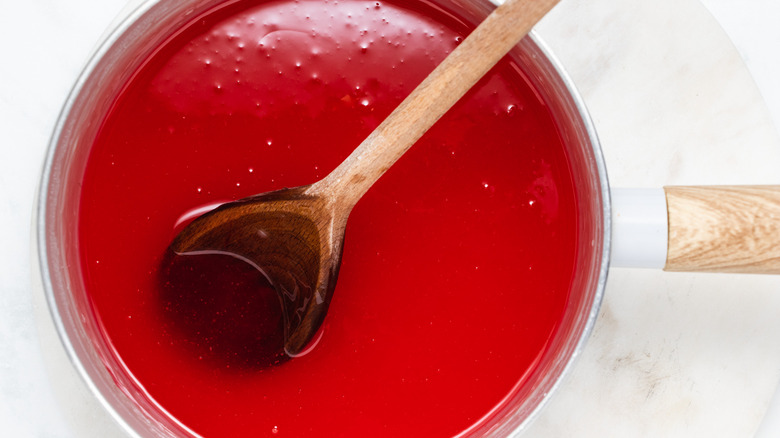 - To a large saucepan, add the remaining water, cornstarch mixture, sugar, lemon juice, and gelatin. Heat over a medium setting, stirring frequently, until the sugar and gelatin have dissolved and the mixture is starting to boil.