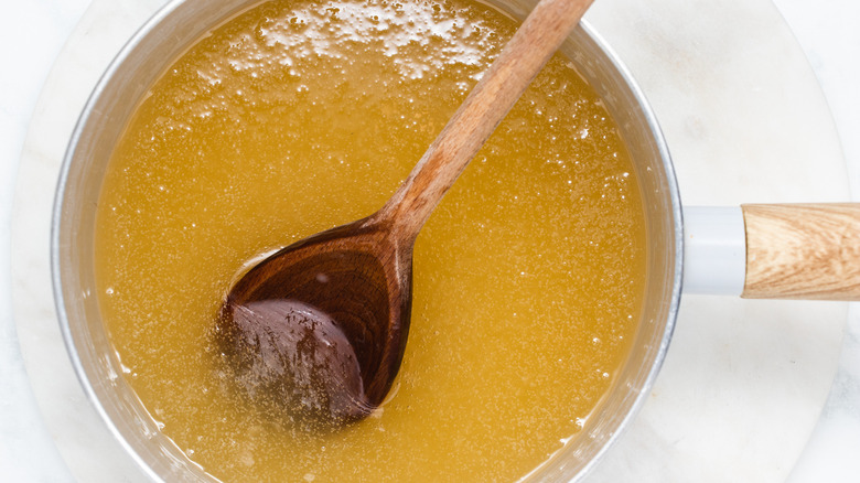 Once the sugar dissolves, reduce the heat to a simmer and let the mixture cook for about 25 minutes, until it achieves a smooth and glossy consistency. "Make sure to simmer the mixture for the full 25 minutes until thickened, as this will ensure it sets later," Brookes notes.