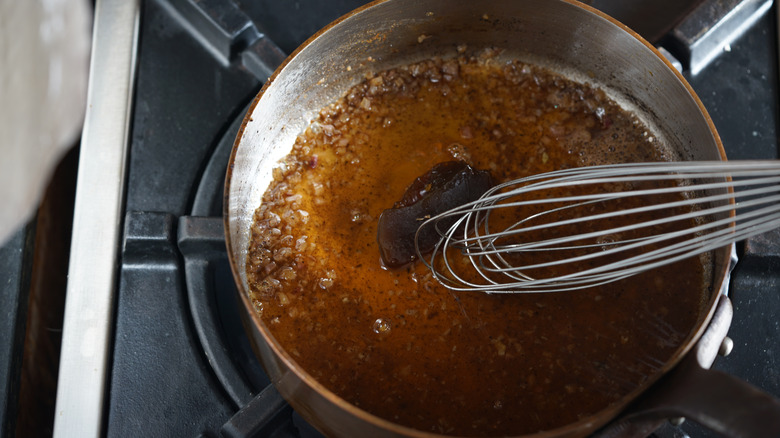 According to Real Simple, you can make that store-bought gravy taste homemade by adding the pan drippings to your gravy while heating it. Stir in that flavorful fond and give it time to integrate with the rest of the gravy over low heat. In addition to this simple hack, Real Simple suggests a boozy way to elevate your store-bought gravy by adding a splash of wine or aromatic herbs to fool your guests into believing your fast-track gravy was more of a labor of love.