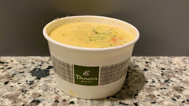 Maybe, as a kid, this was your first introduction to broccoli and carrots sneaking their way into your diet without you being mad about it. Chowing down all that gooey cheddar cheese broth and sopping up leftovers with the baguette, you felt disgruntled only when looking at it because the first bite revealed a whole new world of flavor. From then on, you didn't fear vegetables tastefully dotting your order. Maybe you actually sought them out. That's the power of this Broccoli Cheddar Soup from Panera Bread, everyone.