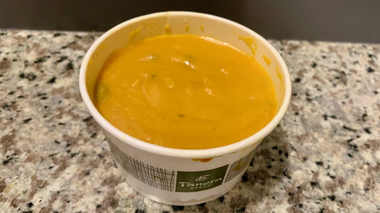 There's some wonderful plant-powered fiber and protein, so don't worry — meatless does not mean unsatisfying. You may have a tough time picking sides for this soup. Dipping the baguette is heavenly, but the subtly sweet cinnamon and brown sugar undertones go pair perfectly with the saltiness of Panera's curly kettle chips. Even still, the stellar autumn vibes of a crispy, fresh apple might just be the best choice of all. Speaking of which, if you're looking for a Panera salad to accompany your soup, the Fuji Apple Salad with Chicken is our personal top pick.