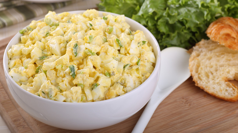 Like chicken salad, potato salad, and deviled ham, egg salad is classified as a bound salad. As Allrecipes points out, these dishes typically contain hearty ingredients – the aforementioned chicken, potatoes, or ham, as well as crunchy, raw vegetables – "bound" in a heavy dressing, quite often mayonnaise. Bound salads can be used in a number of ways, from a simple salad with greens to a sandwich filling to a satisfying side in the case of potato or macaroni salad. If you've ever been to a posh high tea, you were likely served bound salads in between delicate crust-free slices of white bread, AKA tea sandwiches (via Southern Living).