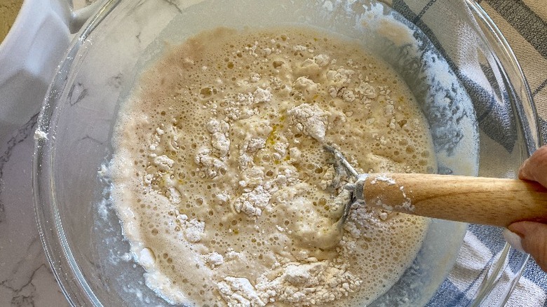 - Add the salt and olive oil and stir well with a whisk. Then add 2 ½ cups of flour and mix until that is combined well. Add 3 cups more flour and keep stirring with a whisk until it is too thick to work with. Turn the dough onto a flat surface and knead the dough for 5 minutes or until it is smooth. As you knead, add in more flour to keep your hands from sticking to the dough.