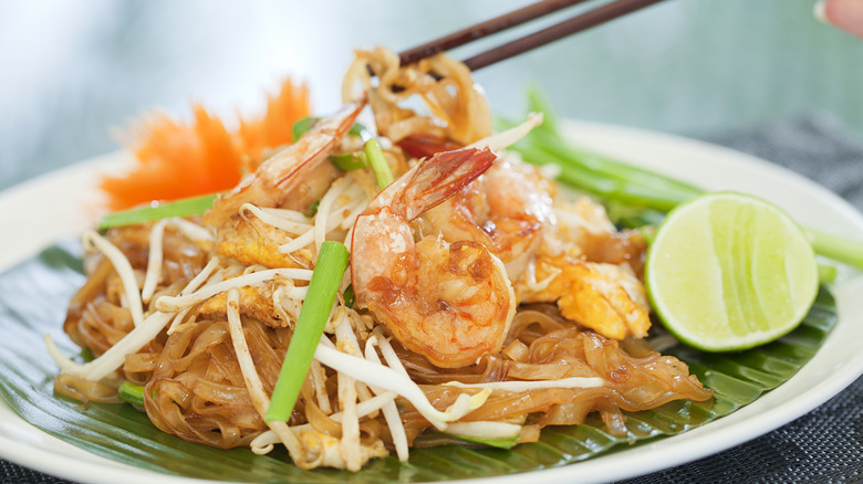 If you're looking to try out the Thai flavors Zimmern describes, there are a host of must-try Thai dishes that offer complex flavor profiles — from spicy to sweet, and salty to sour — at once (via Culture Trip and Flight Centre). Take papaya salad or som tum, for example. This salad is made of a mix of shredded green papaya, carrots, chilies, peanuts, tomatoes, and rice seasoned with garlic, sugar, fish sauce, lime, and tamarind juice. There are always savory pad thai fried noodles or a variety of curries for a spicy option. Slow-cooked pork or khao kha moo is a popular street food item you can smell around the city. The dish encompasses savory, sweet, and sour flavors, with pork that has been slowly boiled in soy sauce and cinnamon for hours until it's fall-off-the-bone tender, and then is chopped and served with pickled vegetables and rice. For sweetness try mango sticky rice, a delightful serving of glutinous rice topped with sweet, cooked coconut milk and topped with fresh mango.
