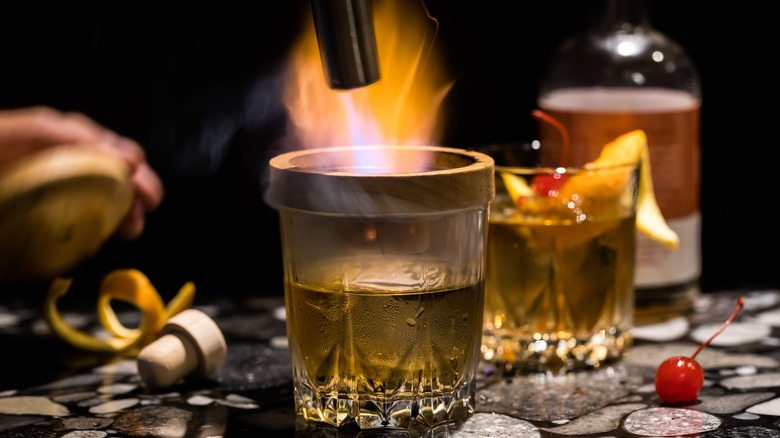 Wood is obviously essential in wood-smoked cocktails, but so are other offerings from Mother Nature. Many common edible items can add flavor to mixed drinks, notes Whisky Advocate, which encourages in-depth experimentation. For example, pecan wood can impart a nutty taste, while oak complements the barrel-aging process of whisky for a charred-wood flavor. But it's not just the wood; you can put a flame to anything from cinnamon to salt, rosemary, or chocolate bitters. Smoked vanilla beans lighten things up, while a garnish of smoked citrus peels allows a slow infusion while you savor every drop.