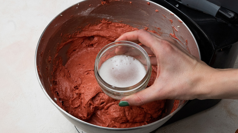 The final step to creating the sponges is to mix together the white vinegar and the bicarbonate of soda and then add it to the cake batter. This small but important addition helps the cake to rise.