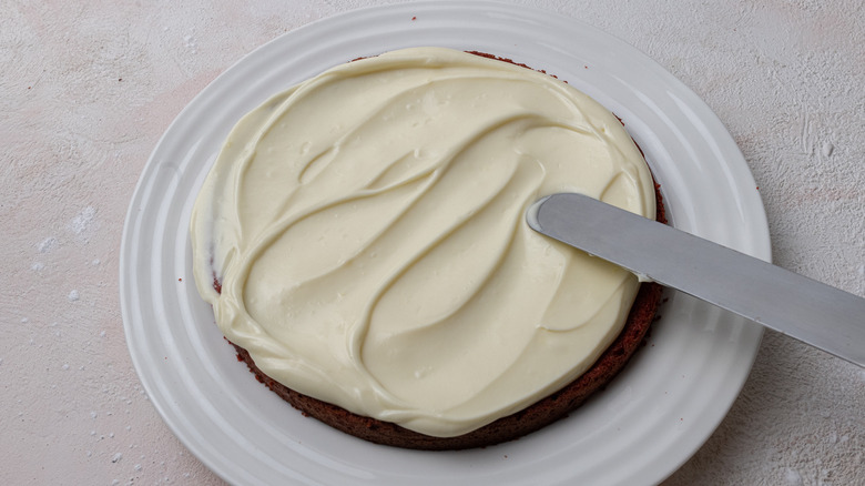 - On a large plate or cake stand, place down a disc of cake, add 3 tablespoons of cream cheese frosting on top, and then spread it out in an even layer. Repeat this process with the remaining 3 cake layers. Spread any remaining cream cheese frosting around the top and sides of the cake. Crumble up the reserved cake trimmings to decorate the top with cake crumbs. Add decorative piping with a closed star shaped nozzle, if desired.