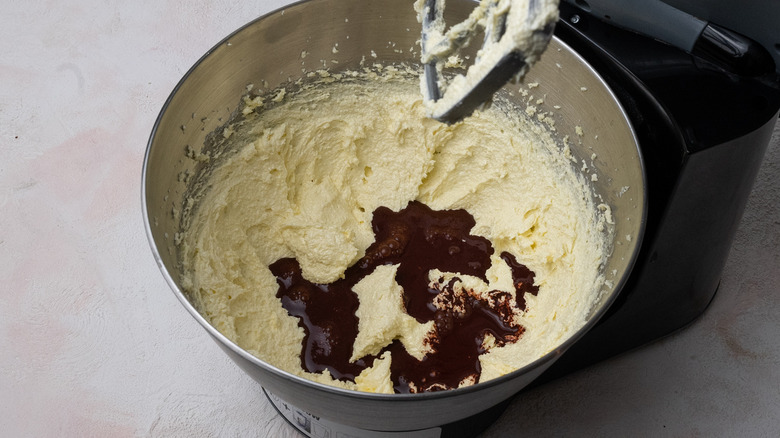 For a great cake sponge it is important to properly cream the butter and the sugar together before adding the other ingredients. This creates little air pockets and helps to produce a lighter textured cake. So, for this recipe you will want to keep your electric whisk or stand mixer on high power and beat the butter and the sugar together until it is pale in color and has a fluffier consistency. This should take a few minutes, and then it is time to add the cocoa powder paste and mix it in.