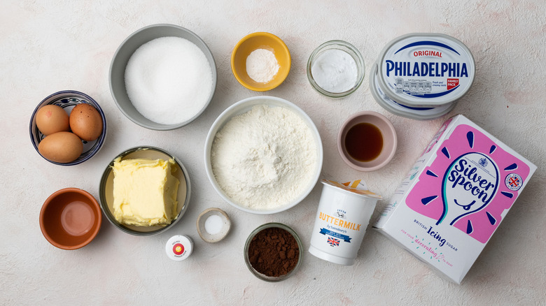 To make this classic red velvet cake, first you will need to gather the ingredients. You will need flour, baking powder, salt, butter, granulated sugar, eggs, cocoa powder, vanilla extract, buttermilk, white vinegar, bicarbonate of soda (aka baking soda), and most importantly, good quality red food coloring. To make the cream cheese frosting you will additionally need cream cheese and powdered sugar. Once everything is assembled you will be ready to begin.