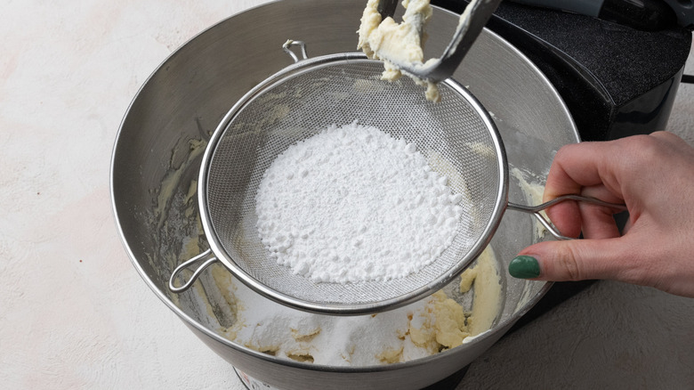 - Slowly incorporate the powdered sugar, using a sieve to remove any lumps, a little bit at a time until it is all combined and the frosting is smooth and silky.