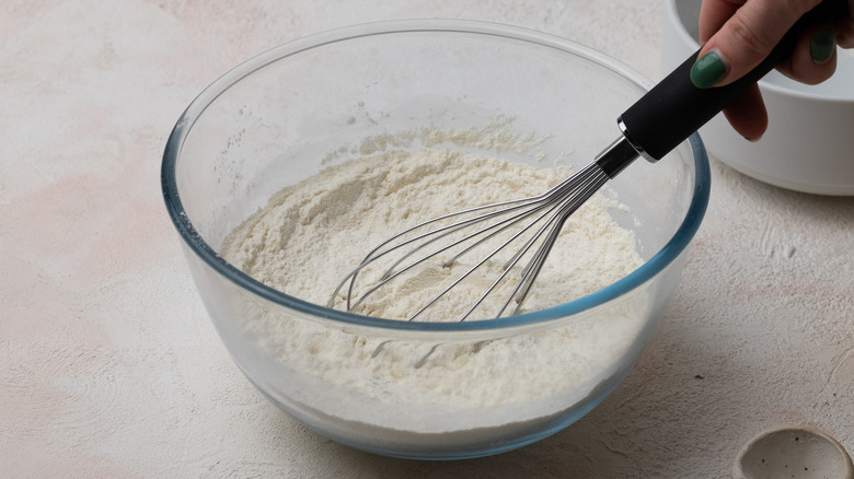 - In a medium-sized bowl, whisk together the flour, baking powder, and salt, then set to one side.
