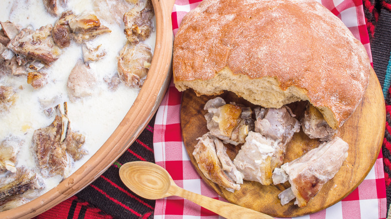 Brav u Mlijeku, also known as lamb in milk, can be found in the northern parts of Montenegro. According to Trafalgar, lamb is combined with root vegetables, spices, herbs, and milk, and then braised in a sac. A sac kind of looks like a paella pan, though Turkish Style Cooking describes it as a "thin sheet metal pan." The thinness of the pan allows for outside heat to be quickly distributed throughout the food, so dishes like lamb in milk can braise in no time at all. Coals are typically used, but as Balkan Recipes notes, you can also use a Dutch oven on the stove.