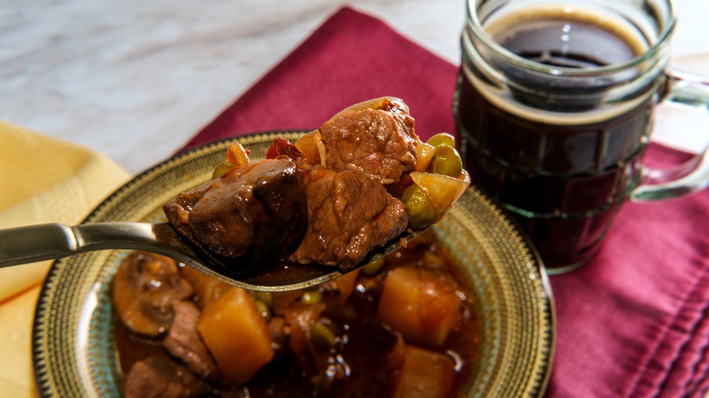 Some of the best ways to cook with stouts are similar to cooking with porters, but the stout's bolder punch and full-body can impart a toasty, malted flavor to everything from the main course to dessert. According to BBC Good Food, a glaze of stout and honey is downright decadent over pork loin, or worked into beef stock for a rich onion soup or beef stew.