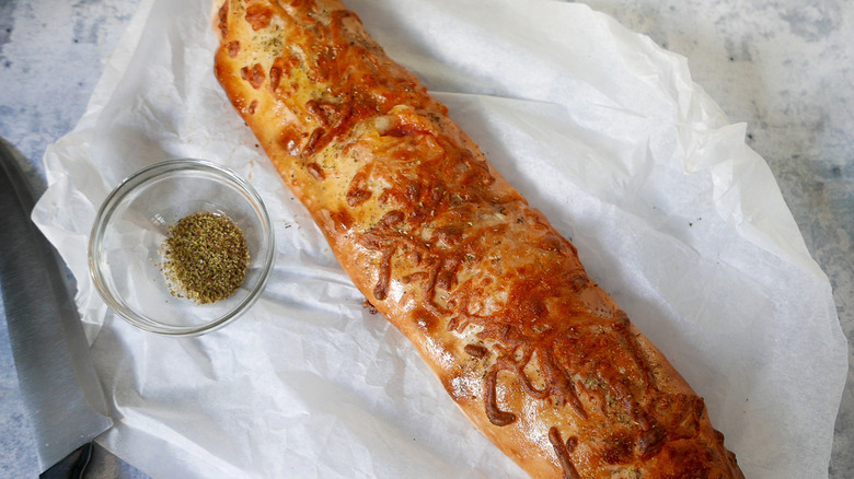 Stromboli, a mixture between a pizza and a calzone, is a savory and undeniably delicious little pocket of food. There are many ways you could customize stromboli, but recipe developer Ting Dalton opts to keep hers classic, incorporating pepperoni in her homemade rendition. Along with cheese (obviously), sauce, a little bit of oregano, and even some slices of salami, you have a simple stromboli that comes together easily, thanks to the use of pre-made dough.