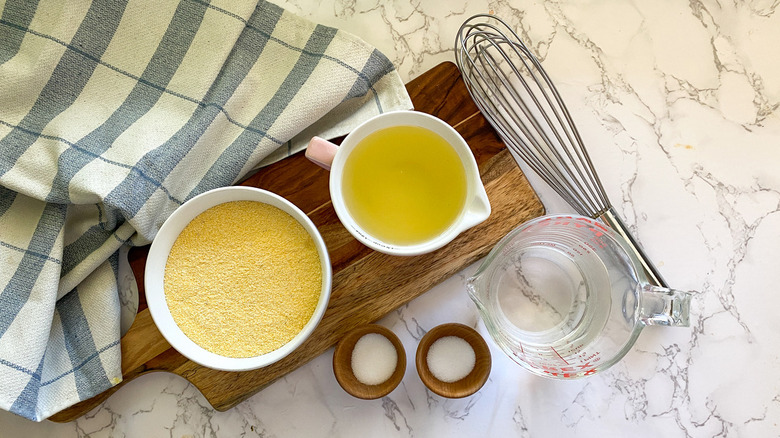 As the title tells us we are going to need some hot water and along with that, there are only a few other ingredients. You'll need cornmeal, sugar, salt, and oil. We love a good recipe using pantry staples!