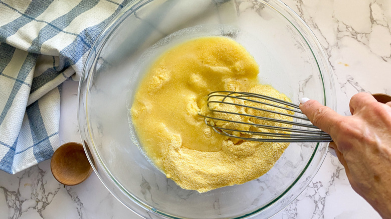 The first step is to boil some water. "I like to use an electric tea kettle because it heats up water super fast, but the microwave is another quick option," Hahn tells us. Then grab a large bowl and combine the water with the cornmeal, sugar, and salt. Stir with a whisk or wooden spoon until you have a thick dough.