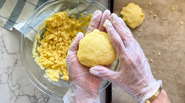 The next step is to shape the dough into patties. This batch will make eight patties that measure 3-inches in diameter. As you form each one, place them on a surface lined with parchment paper so they don't stick. They can also break apart pretty easily, so Hahn advises that placing them in a single layer is the best method for making sure they hold together.