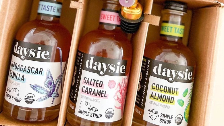 Daysie is a fairly new coffee syrup company, founded in 2022. The branding is representative of the times, with modern and trendy advertising that definitely draws in a younger crowd. With just four flavors offered, as of this writing — coconut almond, salted caramel, Madagascar vanilla, and pumpkin spice — each syrup is made organically with natural ingredients and zero preservatives.