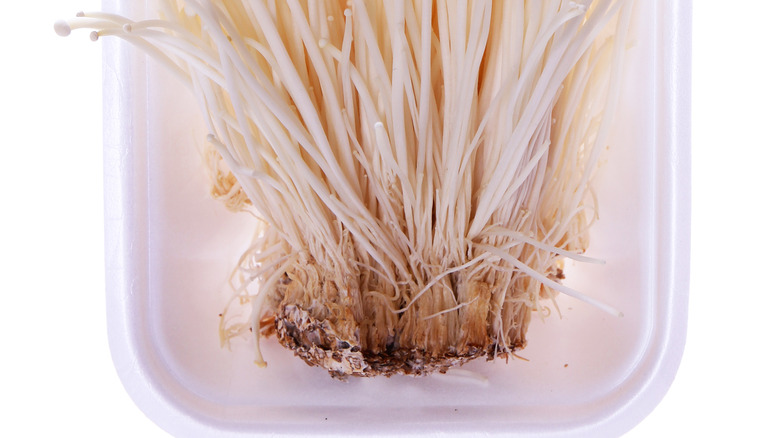 Enoki mushrooms are usually easy to find at grocery stores in the U.S., per Instacart, and usually come in a sealed plastic package, with stems and all. However, these cultivated enoki mushrooms also include the base, which is where all of the stems are clumped together, usually with some dirt as well.