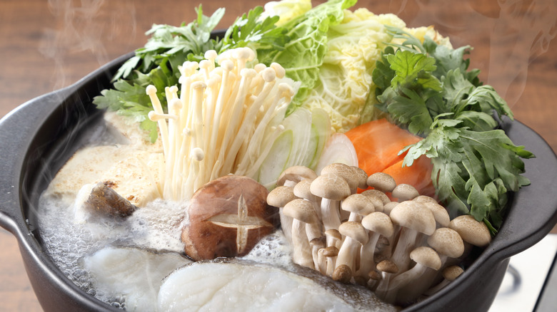 Enoki mushrooms are versatile and are an easy add-on to soups, curries, and stews, according to Nutrition Advance. They can be eaten raw and their unique, crunchy texture may also make them the perfect candidate to provide an autonomous sensory meridian response (ASMR) cooking experience (via Natural Kitchen Cooking School). There are also numerous benefits to be reaped from enjoying enoki mushrooms (per Nutrition Advance). For starters, they are low in calories and contain amino acids, like ergothioneine, which aids in the prevention of oxidative stress and free radical damage.