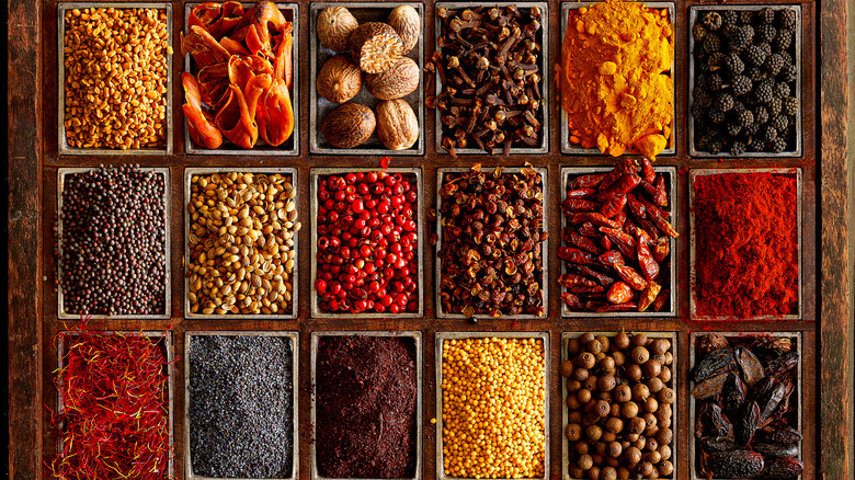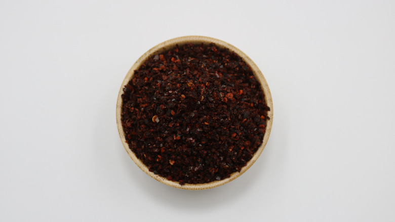 This complex dried pepper hails from Turkey's Southeast Urfa province — hence its name. Also called Isot in Kurdish, the spice is a cousin of the popular Aleppo, grown just across the border. Resembling a bell pepper when raw, the condiment undergoes a drying process that seals in oils. Such treatment significantly darkens the pepper's skin, making it nearly black. Its flavor is chocolatey and raisin-like, with a strong smokey backbone, notes The Spice House. However, don't be misguided by its savory flavors. Urfa biber is relatively spicy, clocking in at 50,000 to 80,000 Scoville units, just a bit more than cayenne pepper, explains MasterClass.