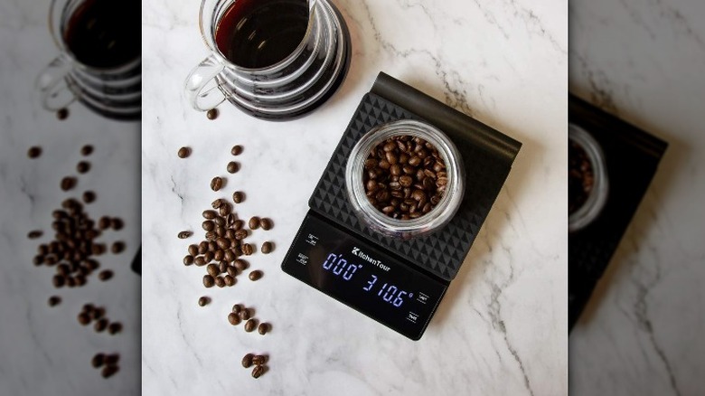 The KitchenTour coffee scale is a precise measuring tool needed for high-end coffee brewers. This scale has both a built-in timer and a measurement scale that can be used to weigh ground coffee, liquid espresso, and brewed coffee with high confidence. When you're making pour-over coffee, you'll appreciate the ability to find the perfect ratio of grounds to espresso to brew an impeccable cup every single time.
