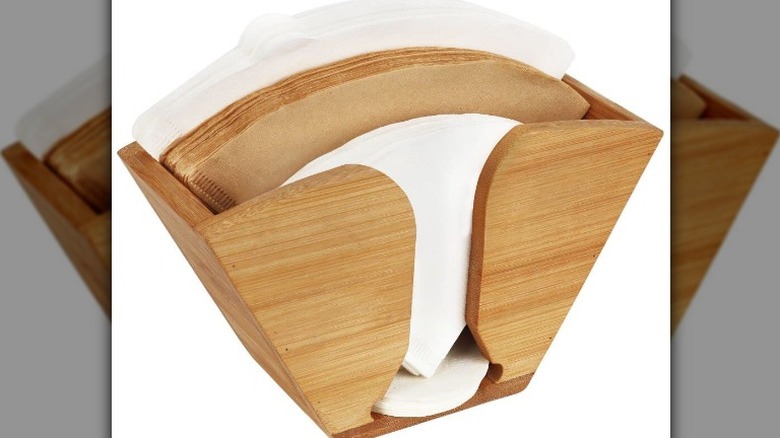To store your filters, simply add the filters to the holder and store them on a countertop or cabinet. It will cut down the clutter in your cabinets and counter space — and it's a much better way to start your morning than leafing through boxes for the filter to fit your machine. We love the wooden bamboo finish on this holder too; it gives off a lot of homeyness that can only be made better with a warm cup of coffee.