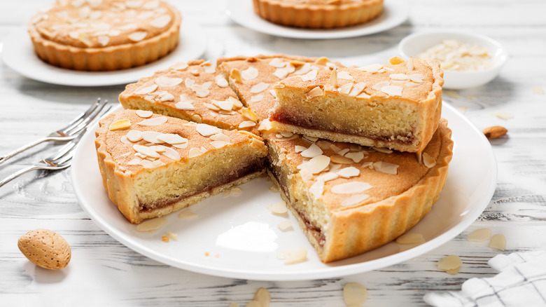 Bakewell tarts can be made with a number of variations, but according to MasterClass, the basic Bakewell is a shortcrust pastry filled with jam, usually raspberry, and frangipane, and garnished with sliced almonds. The end result is an indulgent slice of buttery and sweet almond pastry, cut slightly by the tangy jam. It is a simple, but elemental flavor combination that lends itself to all kinds of baked goods besides tarts, including sweet rolls and cakes.