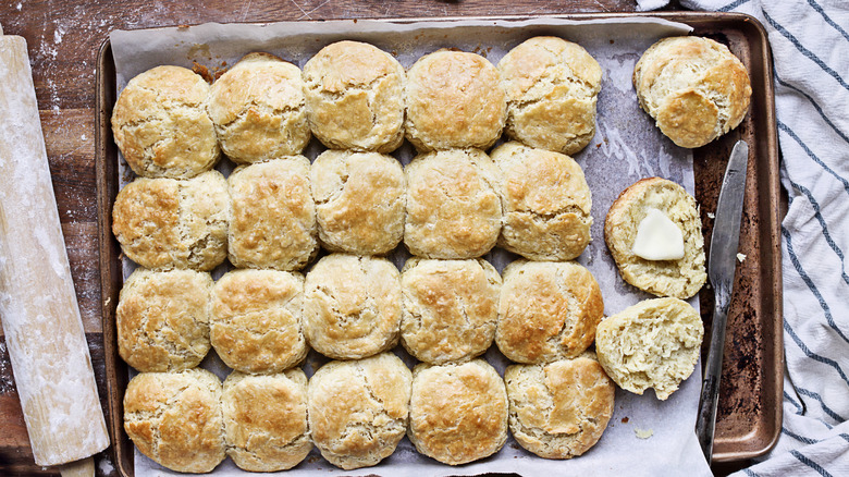 Baking Kneads notes that one of the culprits for dry biscuits is over-baking. The website notes that when the top of your biscuit turns a golden brown color, the interior of the biscuit is usually already dried out. It is better to take the biscuits out of the oven sooner — when the golden hue is super light — rather than keep them in the oven too long. Instead, you can use a simple hack to get the buttery taste and golden hue of a well-made biscuit with melted butter. Use a pastry brush to apply a thin buttery layer as soon as the biscuits come out of the oven.
