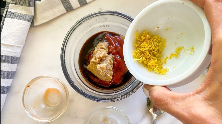 This step right here is where you realize you are never buying pre-made cocktail sauce again — it's so easy. Simply grab a small bowl, and mix together the lemon zest, lemon juice, ketchup, horseradish, Worcestershire sauce, Tabasco, salt, and pepper.