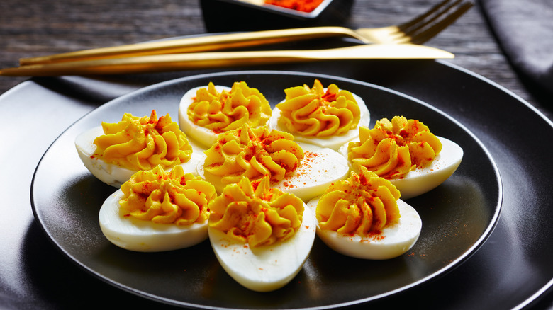 For serving-ready deviled eggs, use a pastry bag instead. You should first be sure to run the yolks through a fine strainer so that small yolk chunks won't clog the tip of the bag. When it's time to set up for piping, we recommend using a star tip for a nice aesthetic design. Try to fill your eggs with one tablespoon of filling per egg and top with paprika.