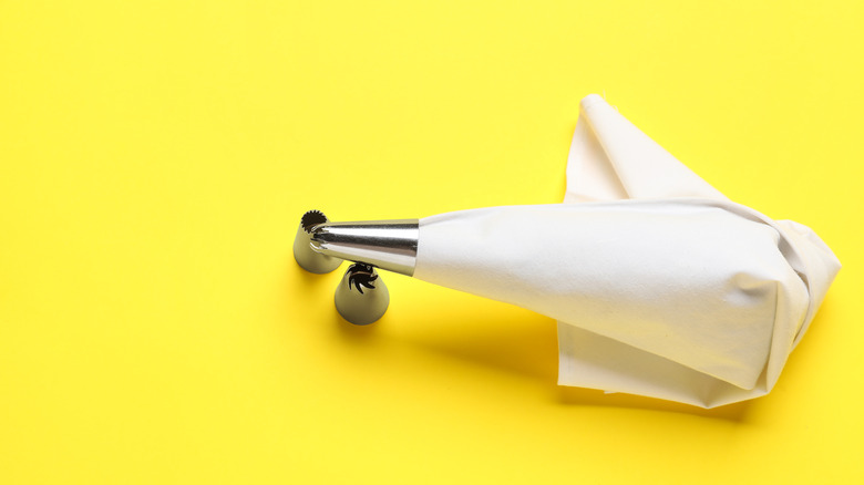 Pastry bags are one of the Swiss Army knives of the baking world. These bags, which are usually made from plastic, canvas, or nylon, are cylindrical in shape and include a hole at the top of the bag for filling. When the filling is added, a small hole is made at the tip of the bag for dispensing the filling. Bakers can affix different metal tips to the bag as well for special designs. According to My Budget Recipes, pasty bags and piping bags are not the same things, although these tools are often used interchangeably in the vernacular. Pastry bags are often called icing bags because they are larger and able to accommodate more filling than piping bags, which are often used for smaller designs and writing.