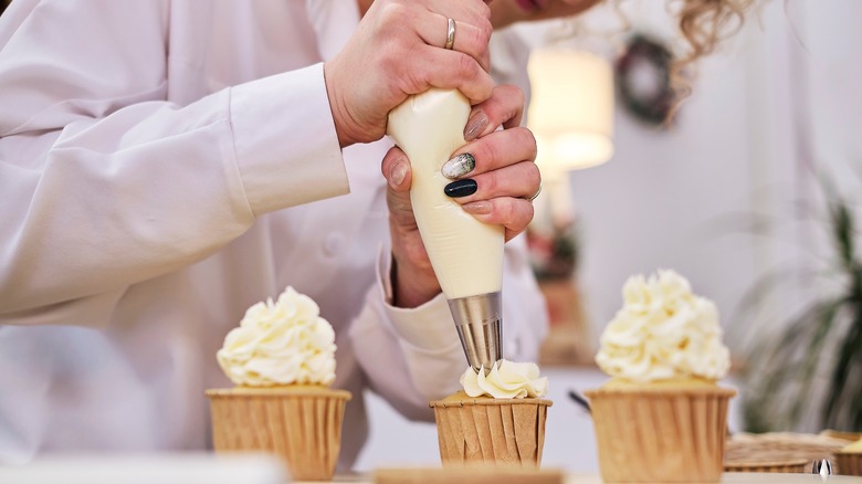 Piping buttercream icing onto desserts