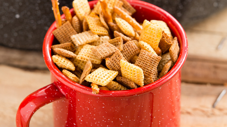 If the ham takes a little longer than you originally planned or your dinner rolls aren't as brown as you'd like, your guests will be left hungry, lingering, and waiting as you finish up what you need to do in the kitchen. Although it's reasonable to assume that unexpected things will happen in the kitchen and extend your expected meal time, you can help soothe hungry guests by offering some quick bites. Fill festive mugs or ramekins with your favorite sweet and salty snack foods and place them strategically around your space.