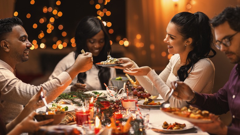 Potlucks are one of the easiest ways to prevent unnecessary stress in the kitchen on the day of your party. Every guest can bring a food they love to make (and hopefully make well) to ensure an abundance of flavors on your holiday table. If you are the kind of person who likes to plan everything to a T rather than a casual "bring whatever you'd like," you can set a theme or a list of foods you want to prepare. If you want to deviate from the traditional holiday party meal, you can ask each of your guests to bring a dessert or just stick to a party full of different types of dips. Alternatively, you can ask guests to bring a dish from their culture or one of their family's holiday favorites.
