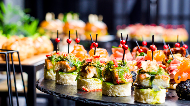 According to Arabella Reeve Catering, canapés are made with four ingredients — a sturdy base (like bread or puff pastry), spread (such as butter or cheese), topping (which can include meat, seafood, or vegetables), and a garnish (like herbs, caviar, or truffles). Canapés are ideal for serving on holidays because the food usually doesn't require any sort of cutlery (meaning fewer dishes). Plus, a well-constructed canapé can be eaten in one bite. This gives you more flexibility for eating and mingling with your guests. If you are thinking about preparing these savory bites for your holiday party without serving a full meal afterward, you should expect to go through about 10 canapés per guest.